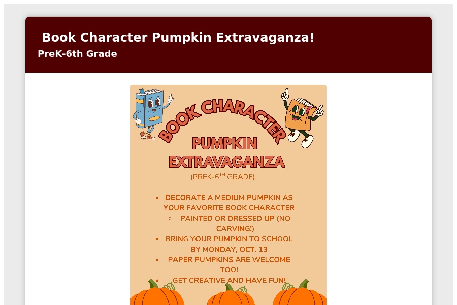 Book Character Pumpkin Extravaganza! PreK-6th Grade Book Character Pumpkin Extravaganza! Studentsget creative and join the fun! Were celebrating re. . .